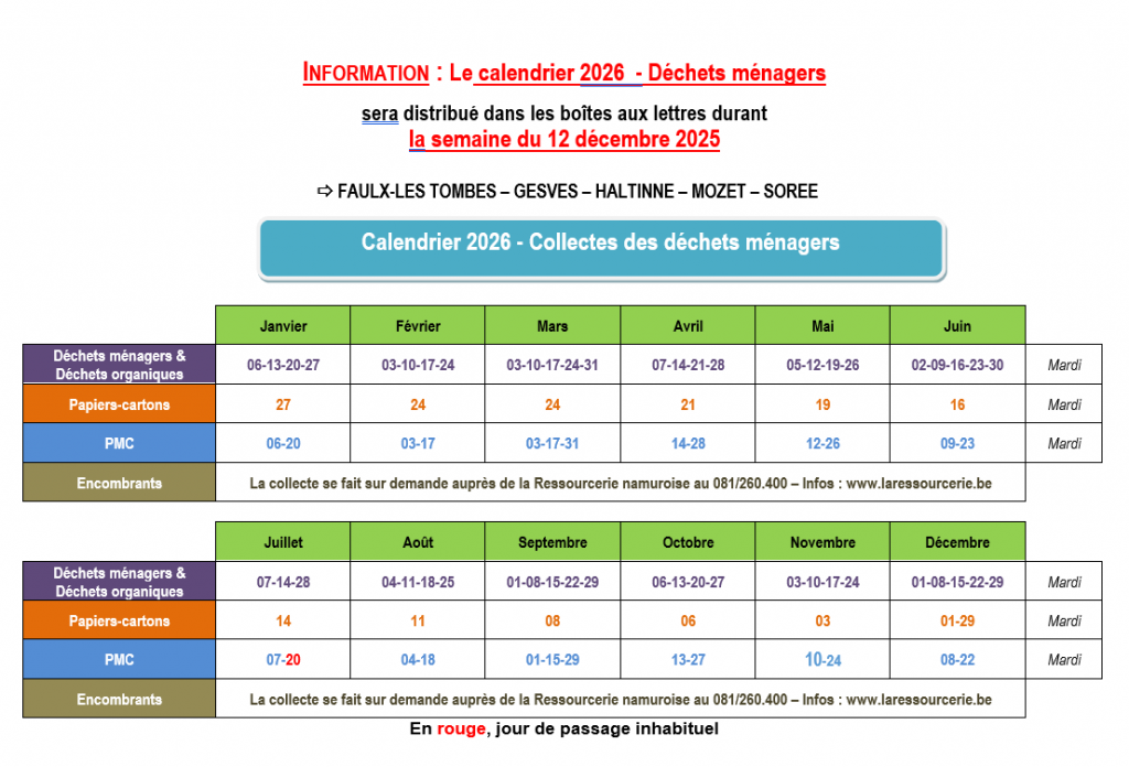 Le calendrier est consultable et téléchargeable directement sur notre site: Déchets ménagers et sacs PMC – La Commune de Gesves